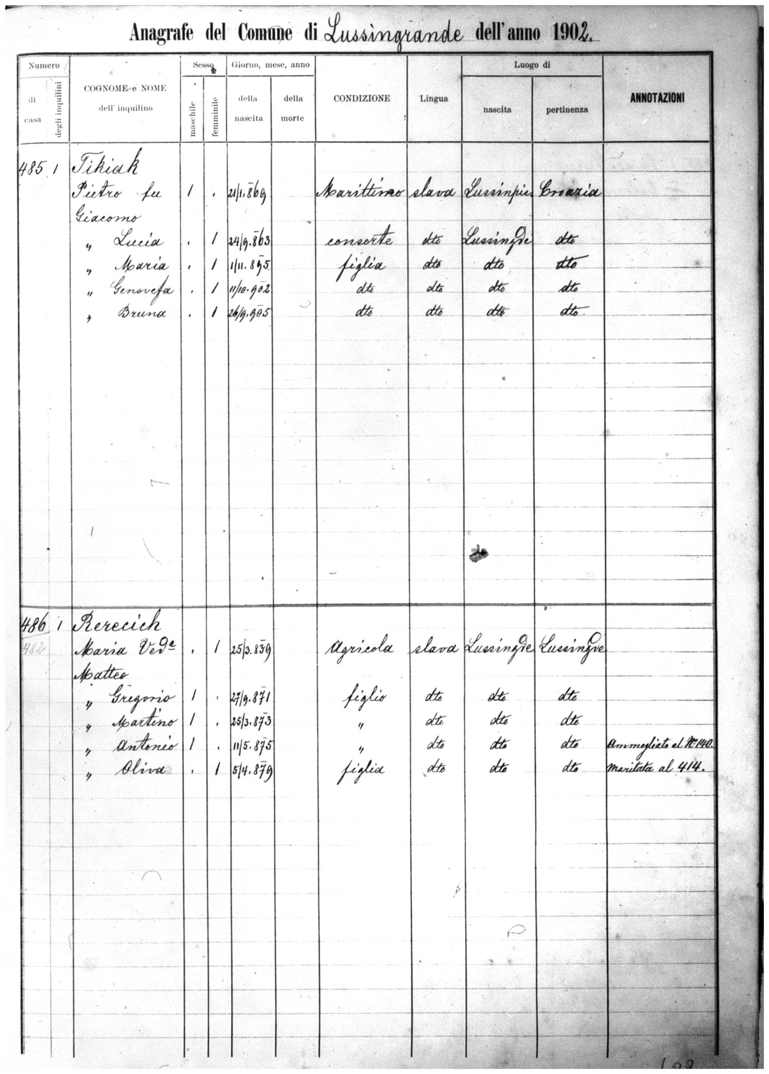 GGF Matteo Rerecich (1839) Family Census Status 1900-1918. Shows my GM Oliva Rerecich (1879) noted that she was married and move to house number 414
